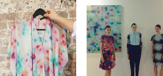 Gary Bigeni's Spring Summer 13.14 collection, Alignment, made for a beautiful, colourful and fun presentation. Models with colour co-ordinating hair wore some of the abstract prints, two of Melbourne-based artist Matthew Johnson's paintings were on display (these were two of six artworks turned into prints for the collection) and there were colourful heart-shaped cookies as a little take home treat!